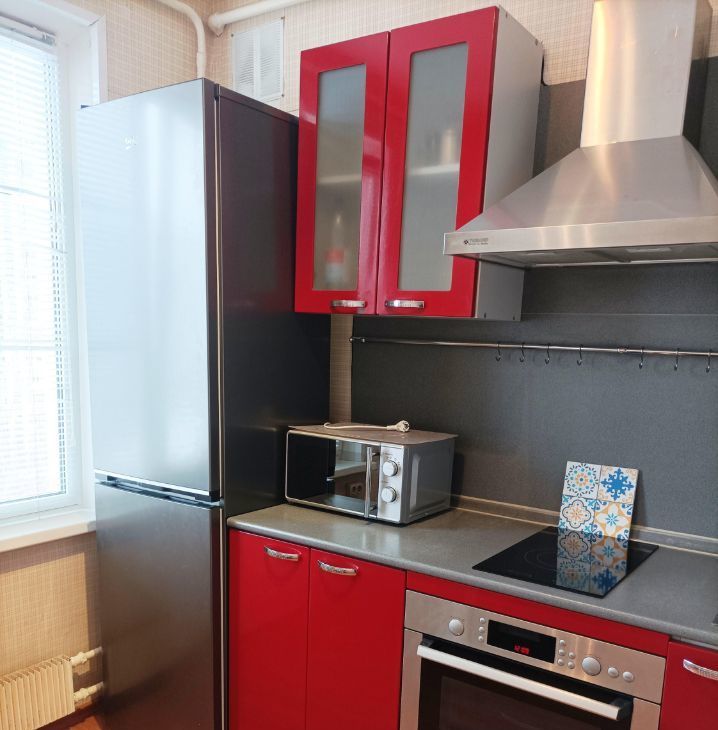 В квартире выполнен косметический ремонт, она полностью готова к проживанию. В комнате и на кухне есть вся необходимая мебель. В комнате шкафы и двуспальный диван.