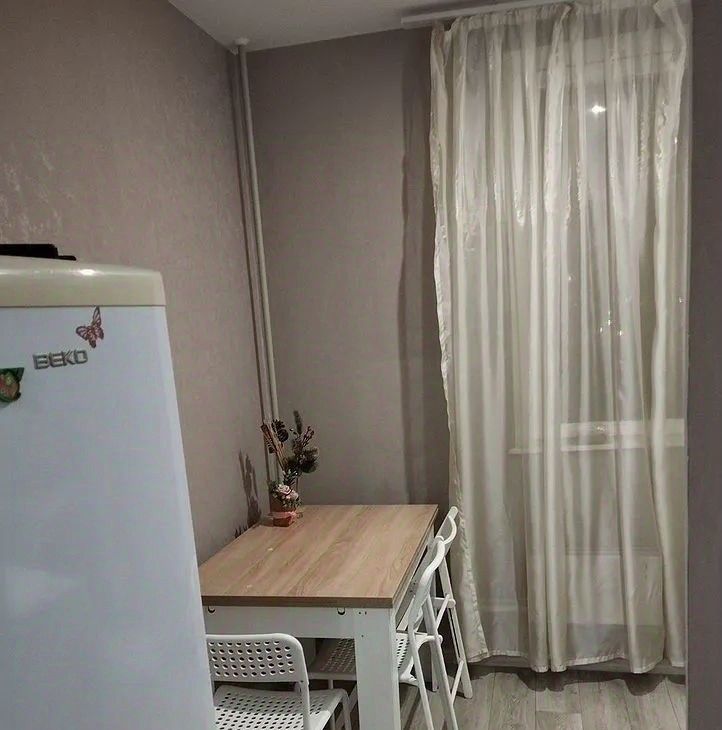 Кухня оснащена современной техникой, включая холодильник и плиту, микроволновку. Имеется обеденный стол и стулья. Санузел совмещенный, оформлен в светлых тонах.