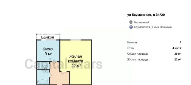 1-к кв. Москва Бауманская ул., 34/20 (36.0 м²)