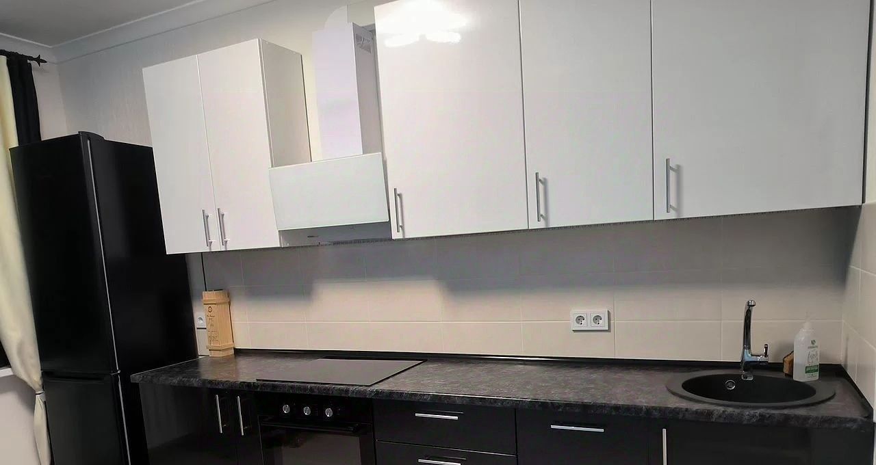 Kухoннaя зoнa: гарнитуp, холодильник, варочная панель, духовка, вытяжка, посудомоечная машина.