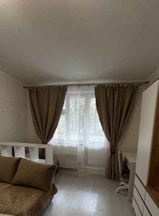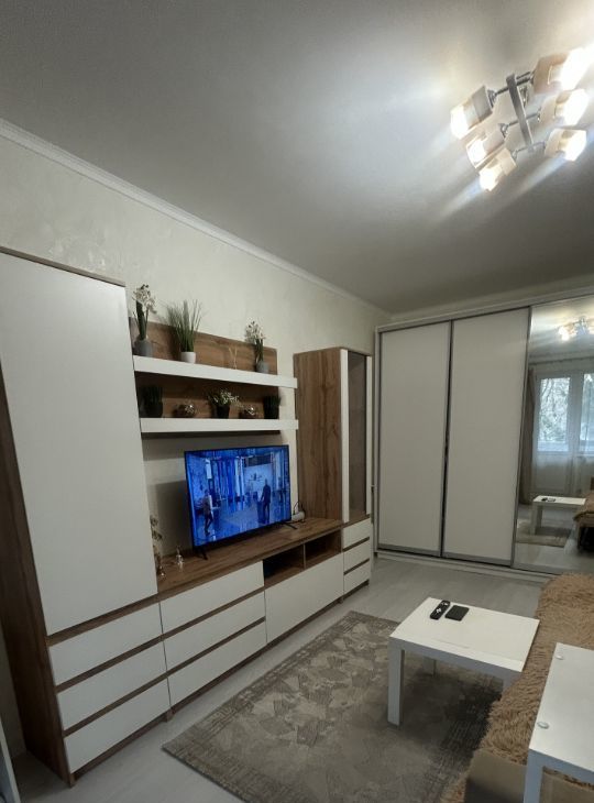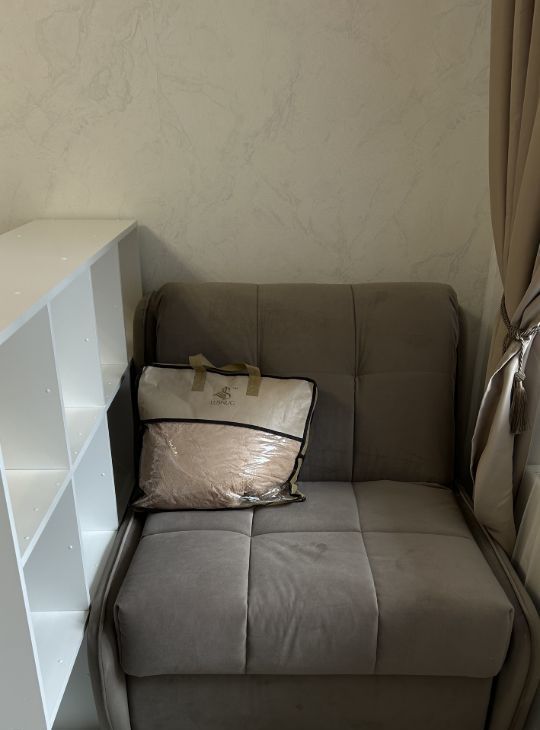 В комнате: стенка с ТВ-приставкой, новый телевизор, очень уютный, раскладывающийся диван, ему в комплект кресло-кровать, которое станет еще одним спальным местом за стеллажом, столик 2 в 1, который может быть и рабочим местом, и косметическим уголком. Все ваши вещи можно разместить в большом шкафукупе.