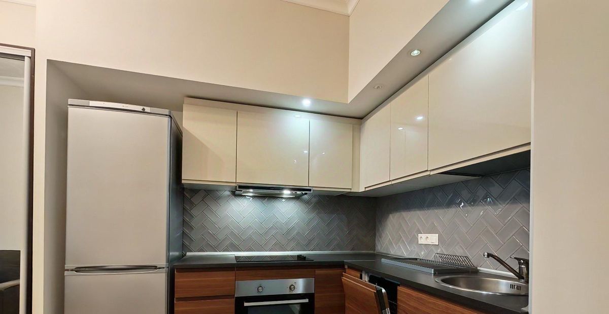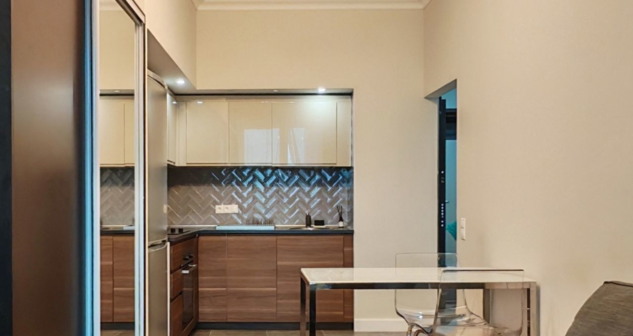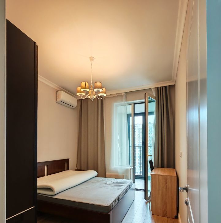 Выполнен качественный ремонт, установлены мебель и техника (кондиционер, диван, двуспальная кровать, холодильник, варочная панель, духовой шкаф, стиральная и посудомоечная машины, телевизор).