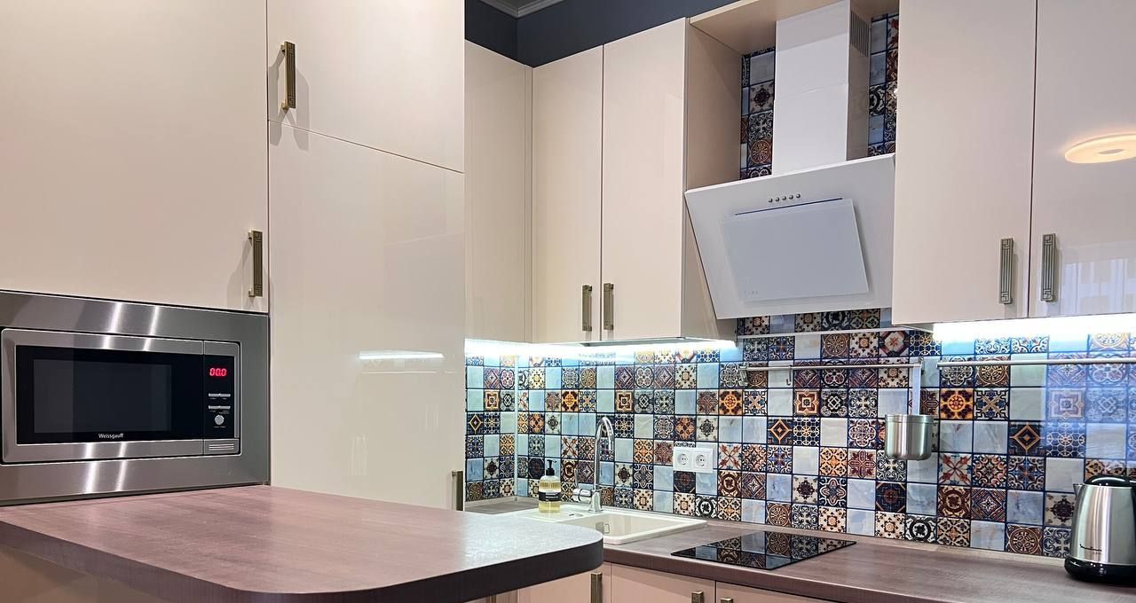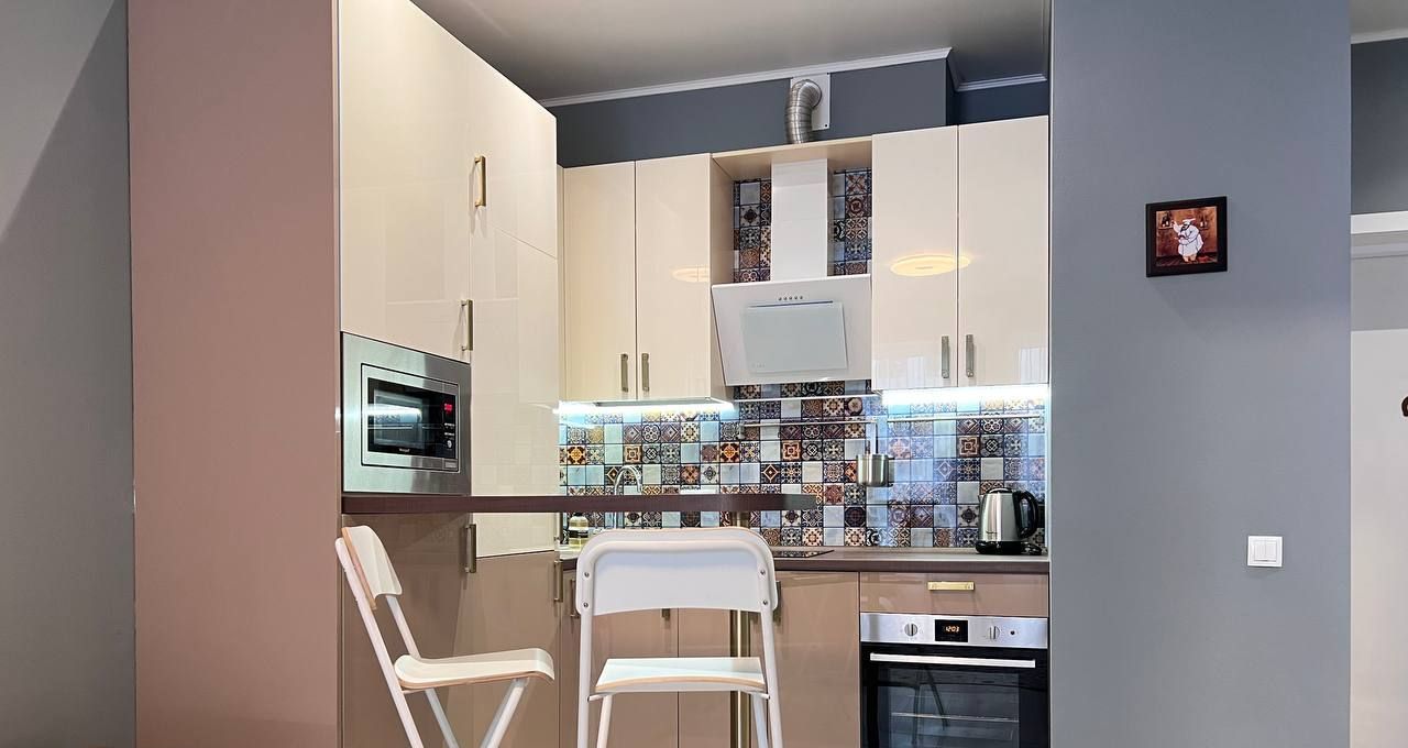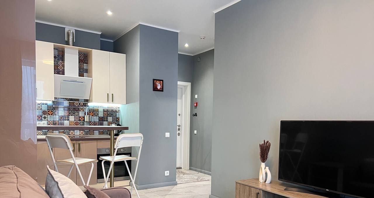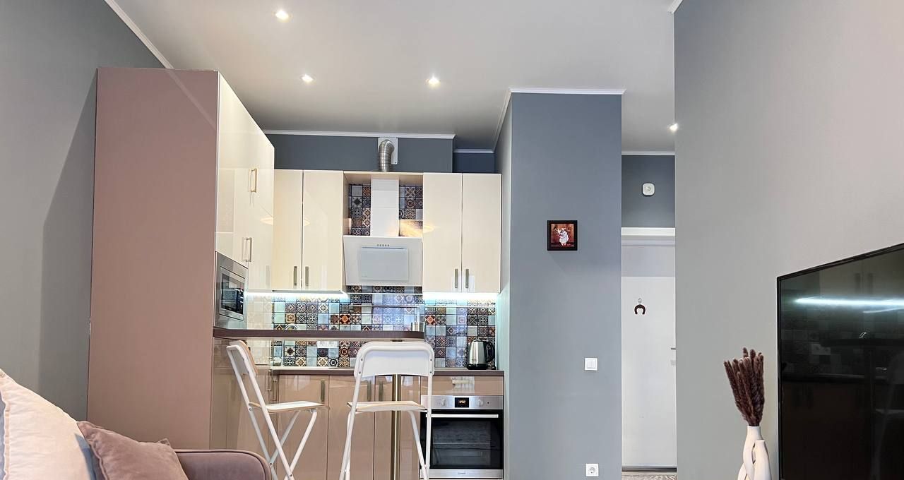 Просторная гостиная зона с кухонным гарнитуром, холодильник, варочная панель и духовой шкаф, ПММ, микроволновая печь, вытяжка, барная стойка со стульями. Удобный раскладывающийся диван, телевизор.
