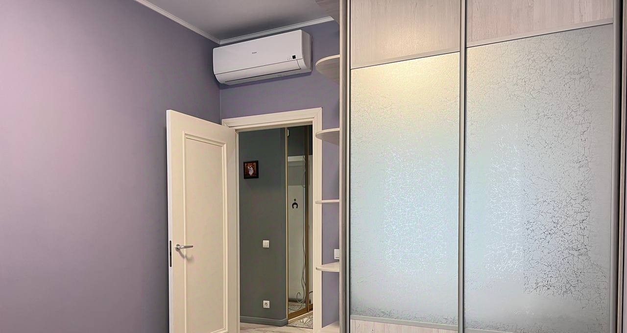 В спальне двустворчатый шкаф-купе, двуспальная кровать с матрасом, комод. Установлен кондиционер.