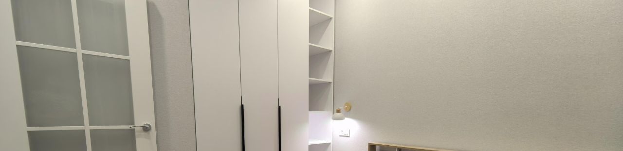 * Вместительная гардеробная и удобные системы хранения (высокие шкафы в пол подчеркивают объем помещения).
