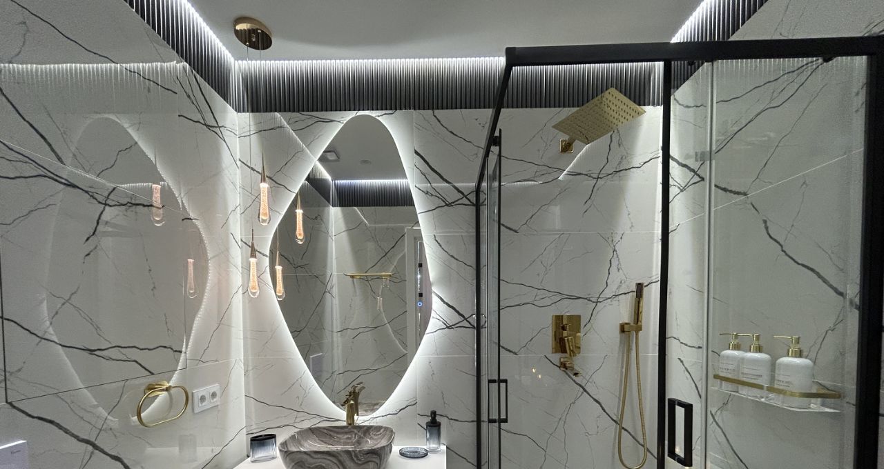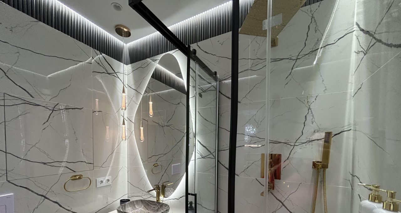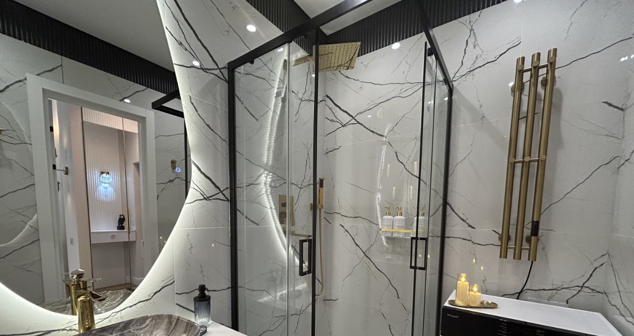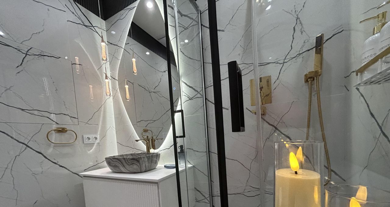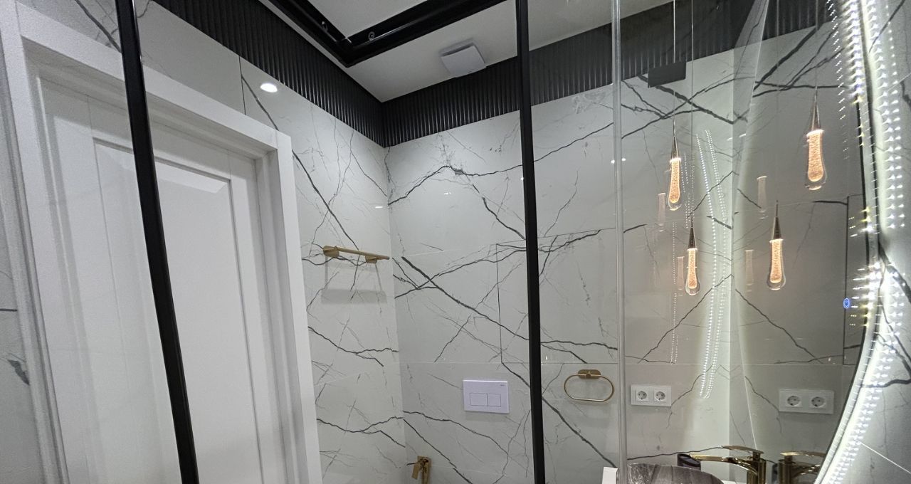 - Санузел: унитаз с инсталляцией, стиральная машина, душевая 90х90 см, широкий умывальник с тумбой, проточный водонагреватель, полетенцесушитель.