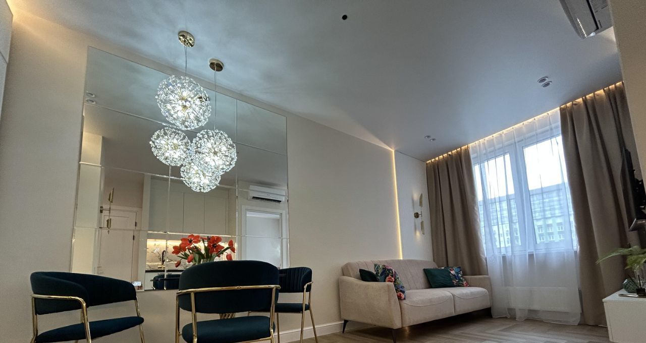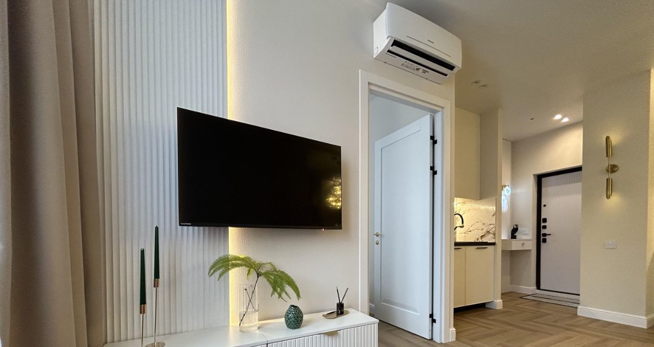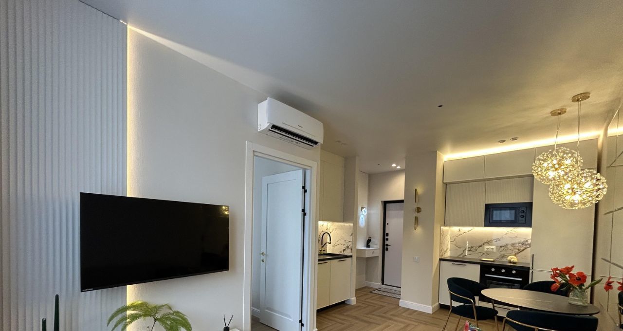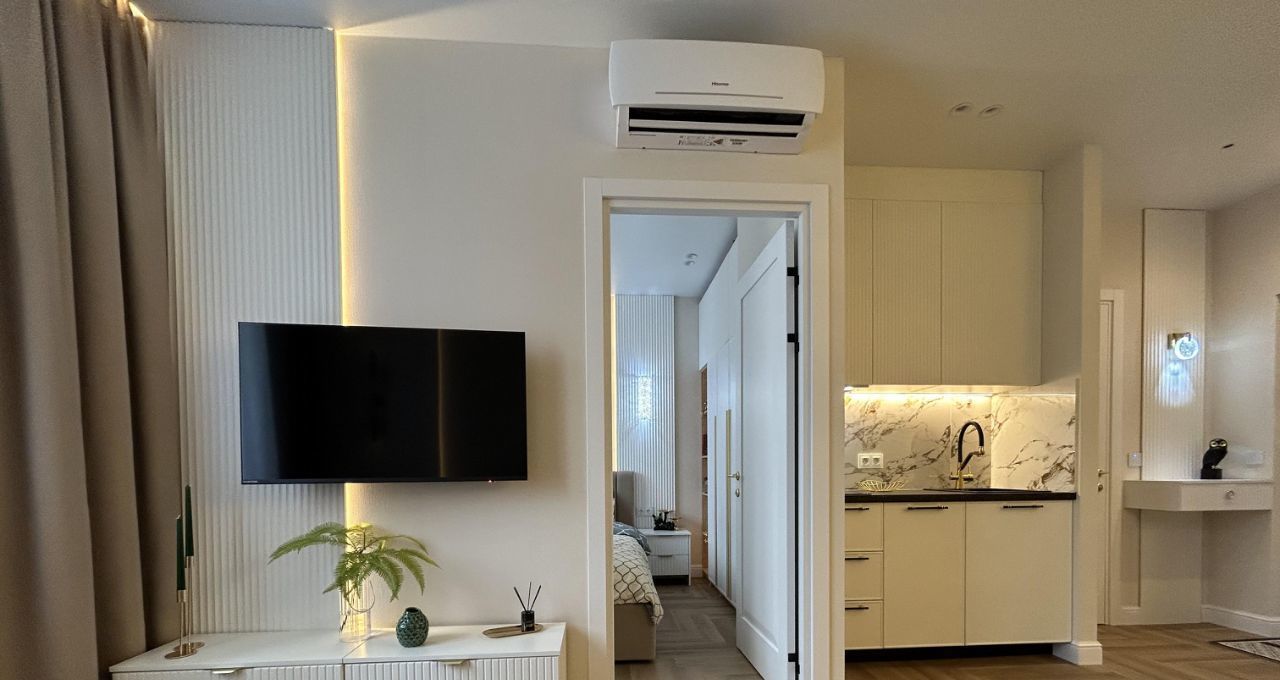 - Гостиная: удобный диван раскладной с местом хранения, кондиционер, телевизор с Яндексом, стол + 3 стула.
