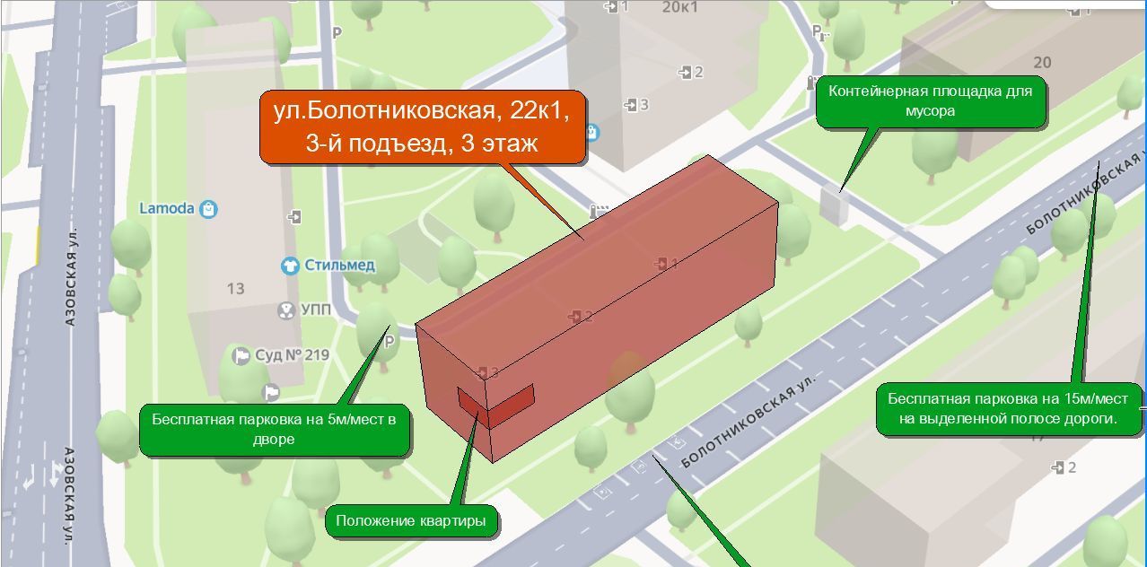 Парковка во дворе и на выделенных полосах улицы. Схема парковки приложена к объявлению. Въезд во двор свободный, без шлагбаума.