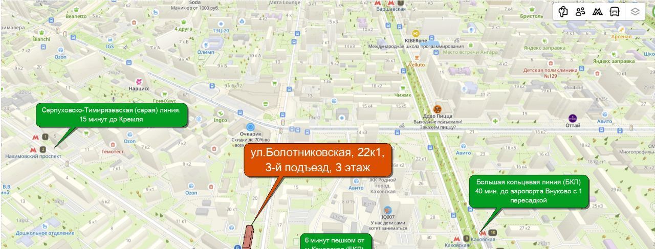 В пешей доступности от дома находятся станции метро Каховская (6мин), Севастопольская (8мин), Нахимовский проспект (11мин), Варшавская (17мин).
