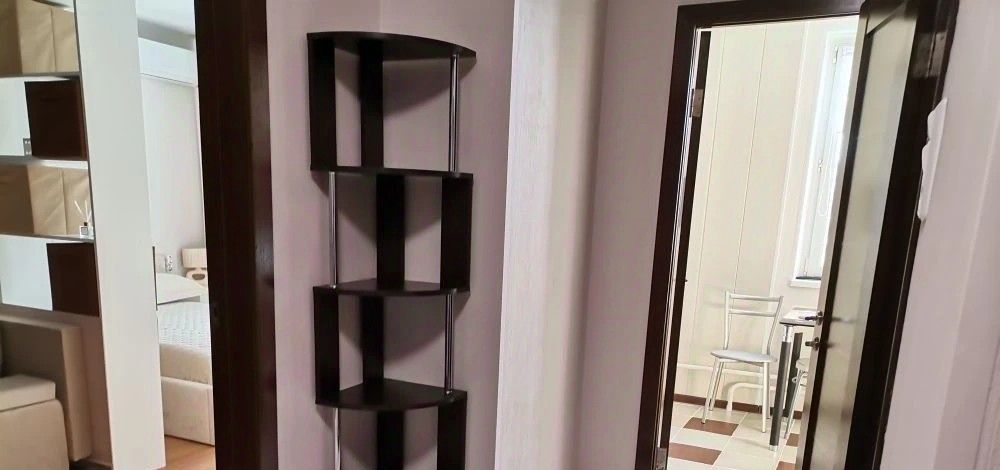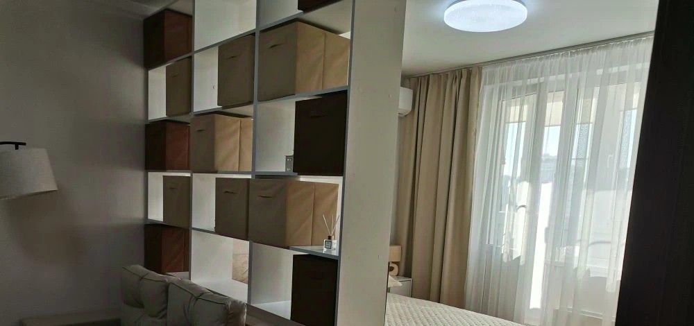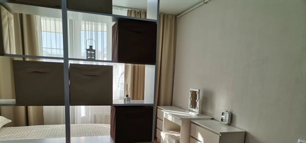 Комната разделена на зоны спальни с полноценной двуспальной кроватью с ортопедическим матрасом и гостинной с раскладывающимся диваном, ж\к телевизором. В комнате установлен кондиционер. В ванной комнате импортная стиральная машина-автомат. В кухне холодильник, электрическая плита со стеклокерамическим покрытием и духовкой. Чистый подъезд. Интеллигентные соседи.