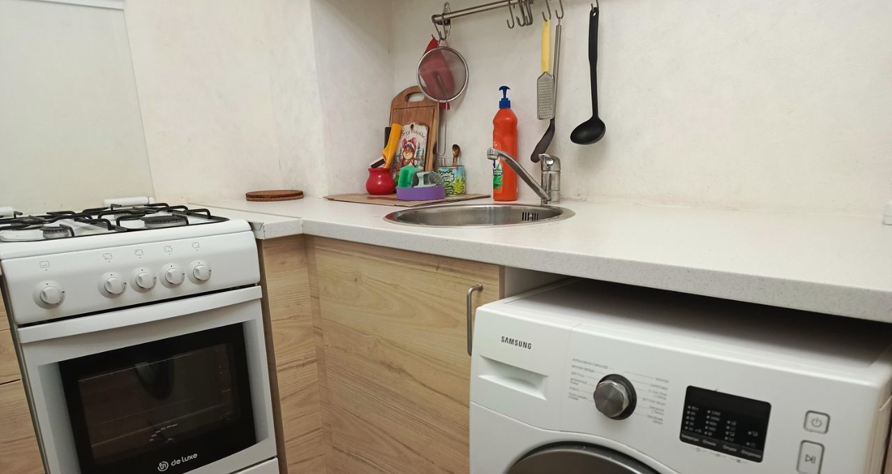 Двуспальная кровать, два шкафа для хранения вещей, кухонный гарнитур. Необходимая бытовая техника-холодильник, стиральная машина. Также имеется посуда.