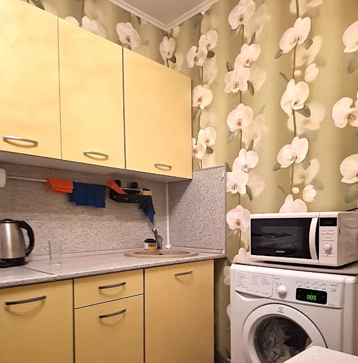 - кухня: кухонная мебель, холодильник, стиральная машина, плита газовая, микроволновая печь, стол, табуреты.