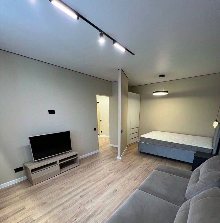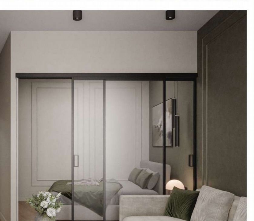 Спальня будет в ближайшее время выделена перегородкой между гостиной и спальным местом и квартира станет уже 2-х комнатной. Видно на последнем фото как будет выглядеть.