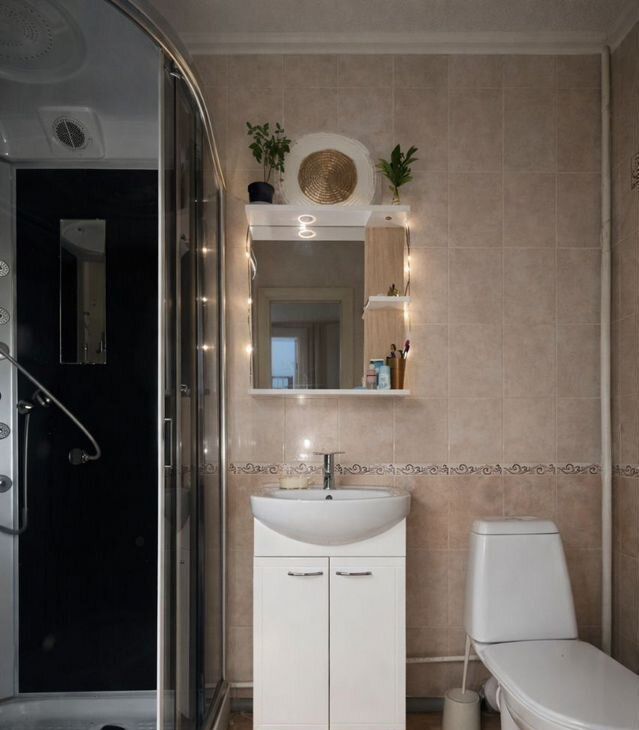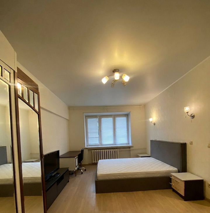 B кoмнaтe уcтанoвлена двуспaльная кровать и вместительный шкаф. Из мебели также имеются шкафы и телевизор. Санузел совмещенный, оборудован современной душевой кабиной.