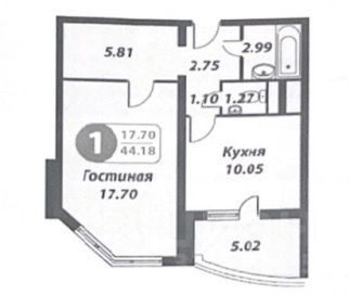 По планировке: общая площадь 44,2 кв.м, комната 18 кв.м, кухня 10кв.м с выходом на просторную шестиметровую лоджию, раздельный СУ, гардеробная, просторный коридор, высокие потолки 2,8 м.