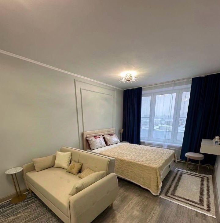 Пространство грамотно зонировано: выделена полноценная спальная зона, уютная гостиная и отдельное место для подготовки к макияжу/ уходу за собой.