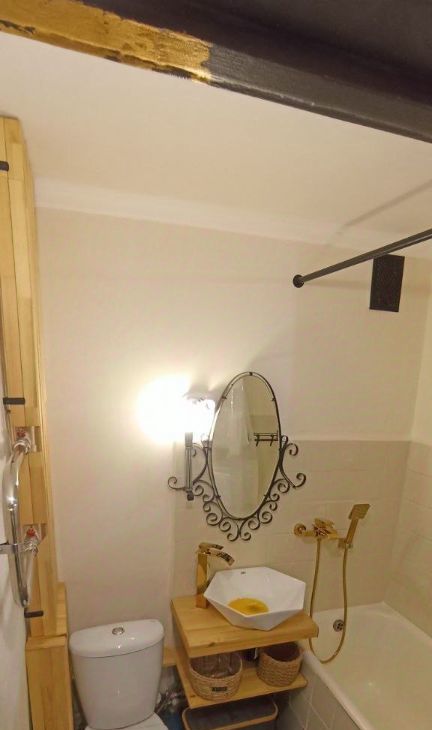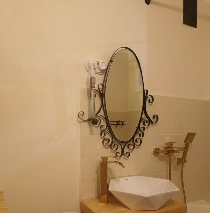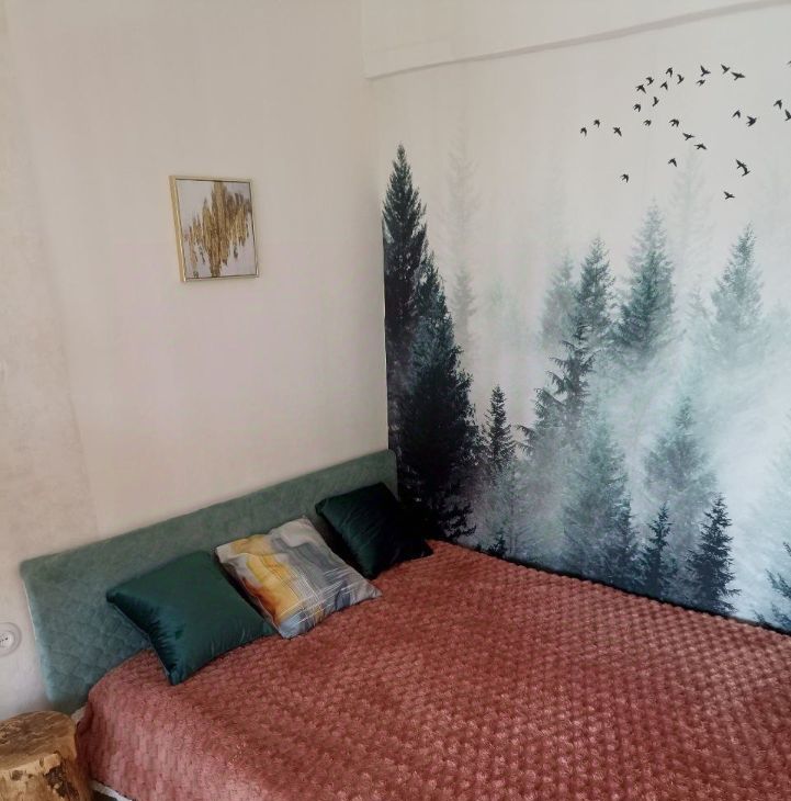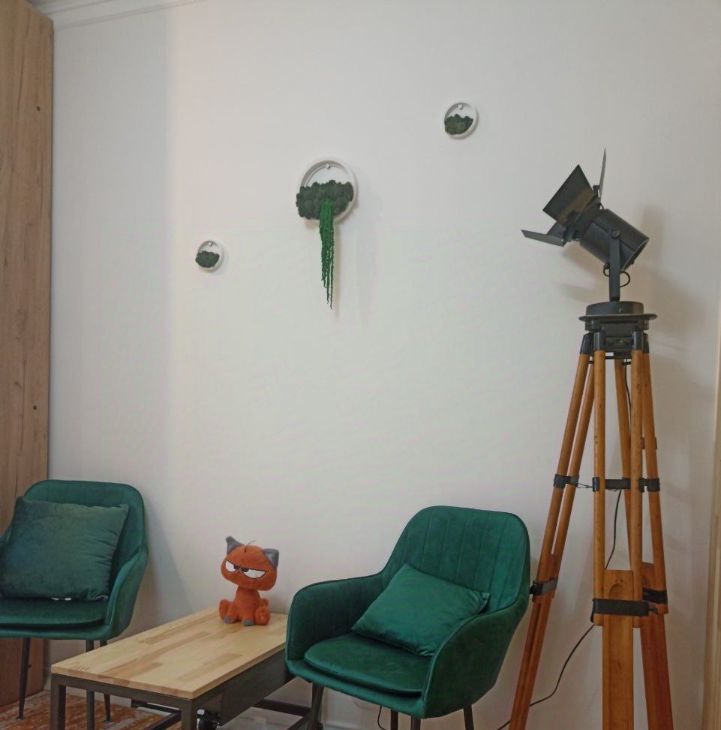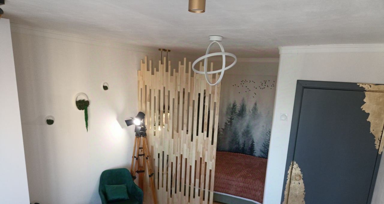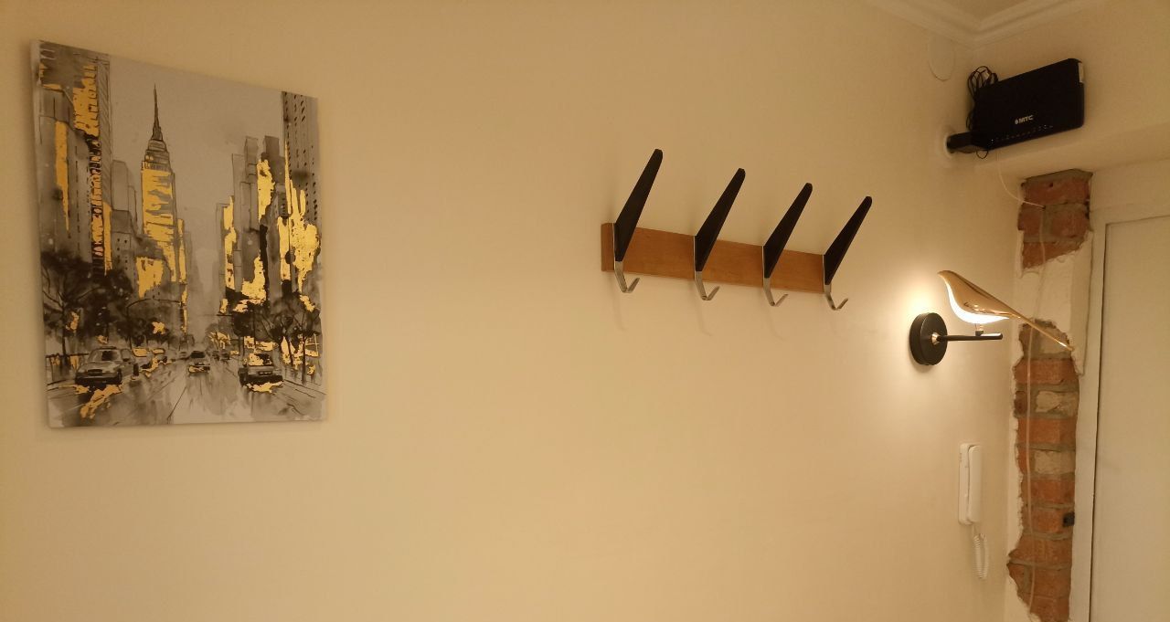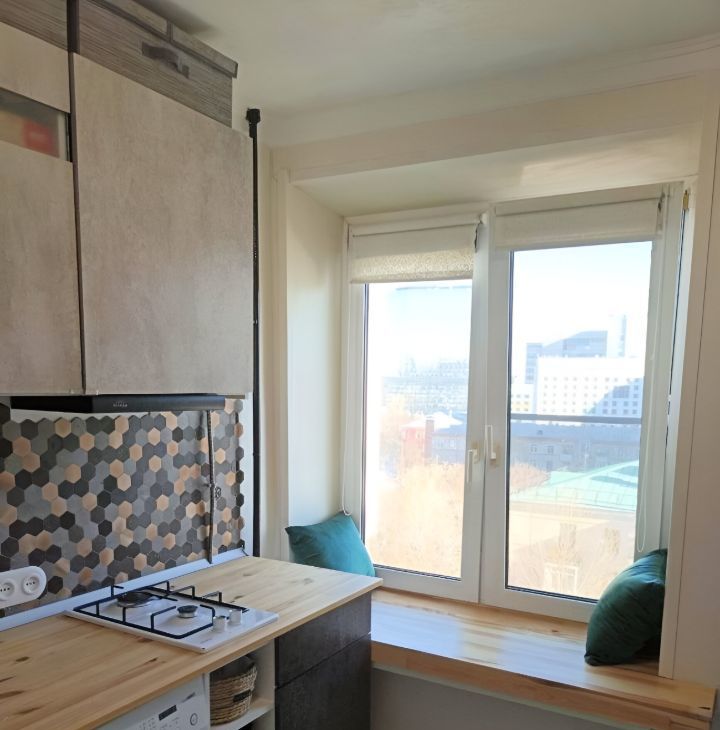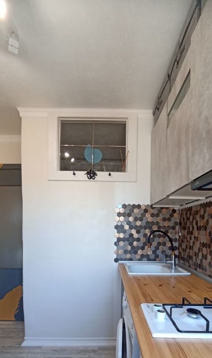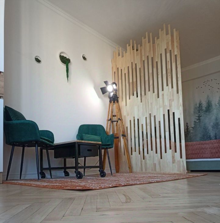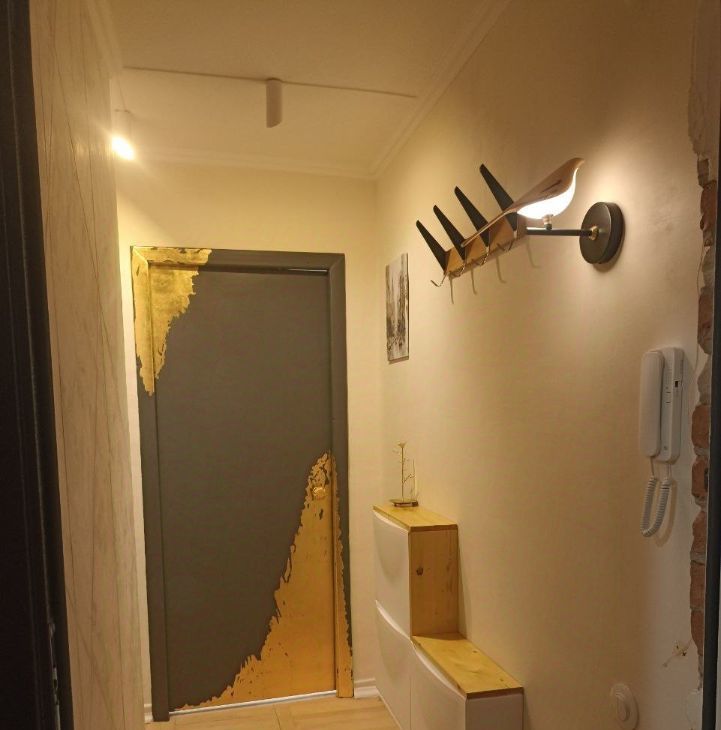 Бо'льшая часть дизайна из натуральных материалов. Дизайн в стиле эклектика, много художественной ручной работы. Стиль воплощает в себе современную строгость, аутентичность лофта и душевность старинных элементов, которые намеренно были сохранены и вплетены в современность. Несмотря на свою компактность много места для хранения. Удобная планировка: изолированная комната, застеклёный балкон. Двухместная кровать, с подъёмные механизмом ( внутри также есть место для хранения).