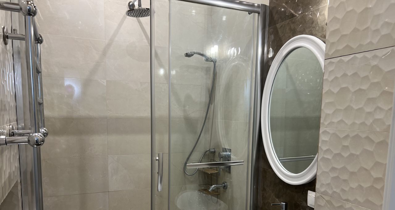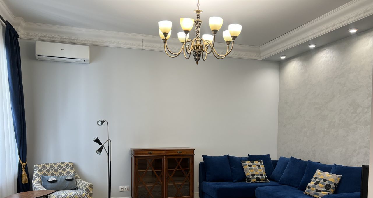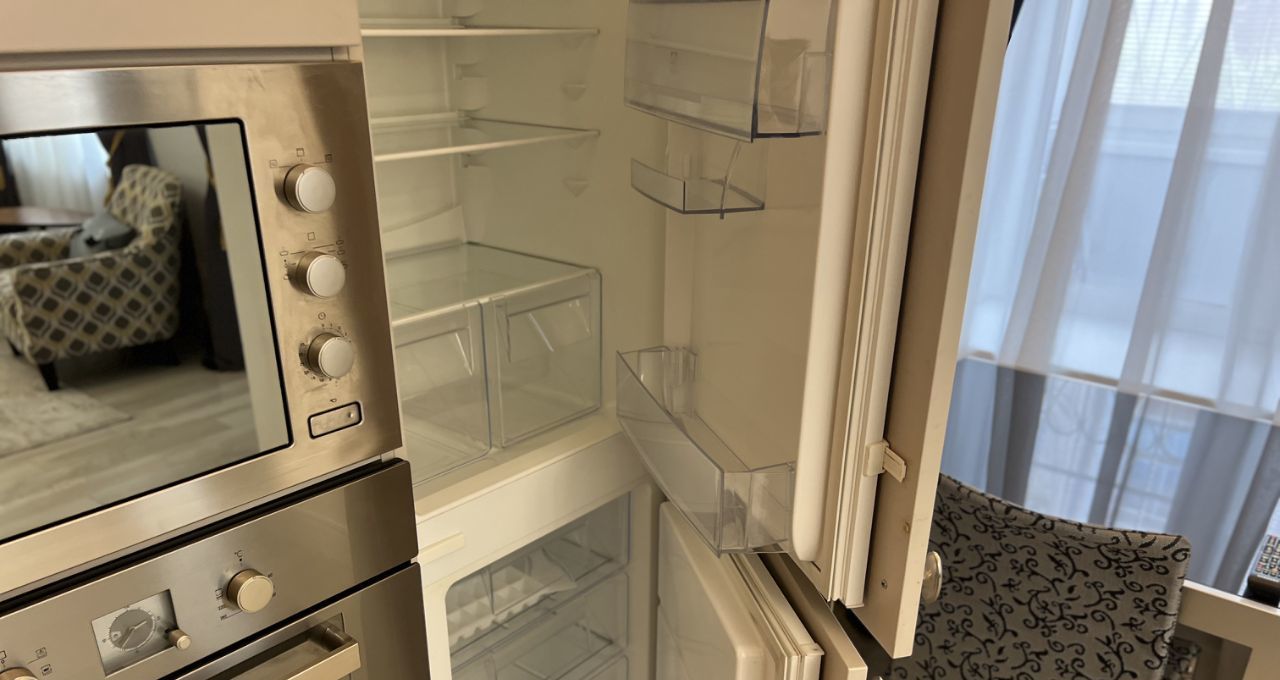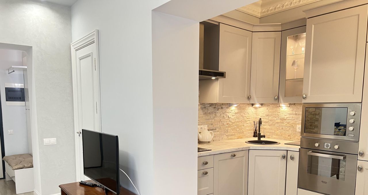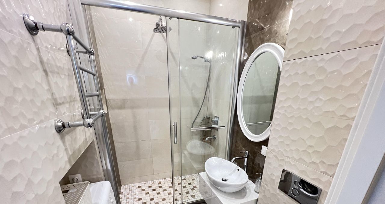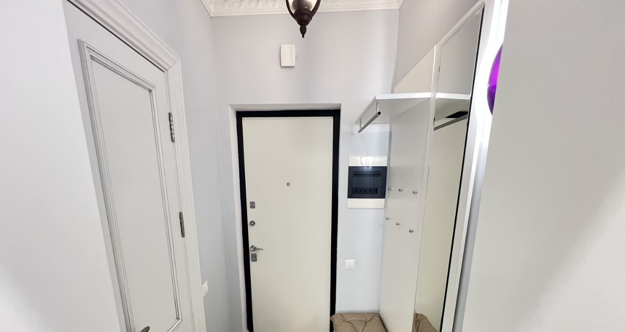 В квартире есть все необходимое для комфортного проживания: современная мебель на кухне и в комнате, а также вся необходимая техника — кондиционер, холодильник, посудомоечная машина, телевизор и стиральная машина. Санузел совмещенный и оборудован душевой кабиной. Есть застекленная лоджия.
