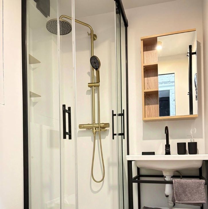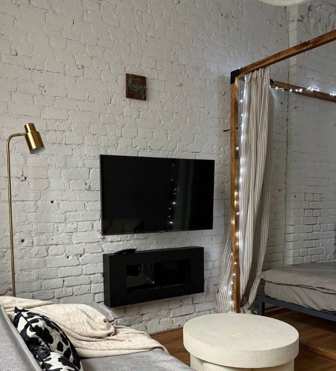 В квартире сделан дизайнерский ремонт, продуман каждый элемент интерьера. Комната обставлена мебелью. Из техники есть всё необходимое: кондиционер, холодильник, телевизор, посудомоечная и стиральная машины. В ванной комнате установлена душевая кабина.