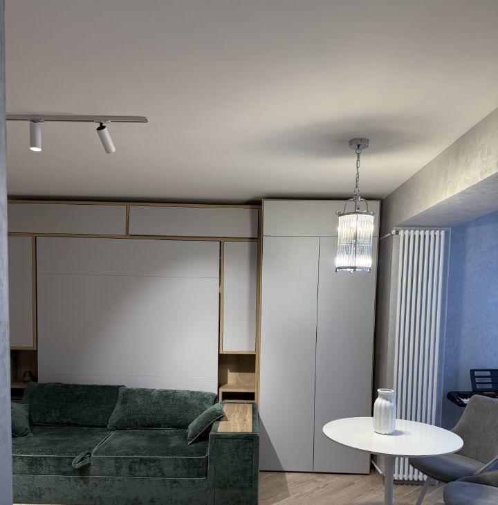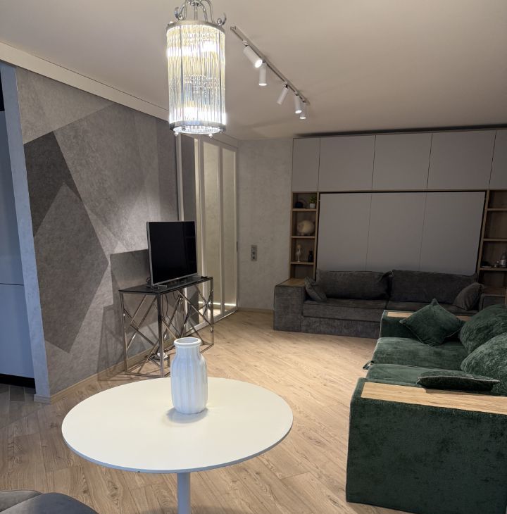 В квартире сделан дизайнерский ремонт, который создает атмосферу уюта и комфорта. В комнате установлены два блока мебели- трансформеры, которые превращают гостиную в спальню с удобными кроватями укомплектованными элитными матрасами. Квартира укомплектована современной техникой: кондиционер, холодильник, телевизор и стиральная машина. Санузел совмещенный, оборудован ванной. Окна выходят на улицу, а также есть лоджия для вашего удобства. Подключен интернет, поэтому всегда будете на связи.