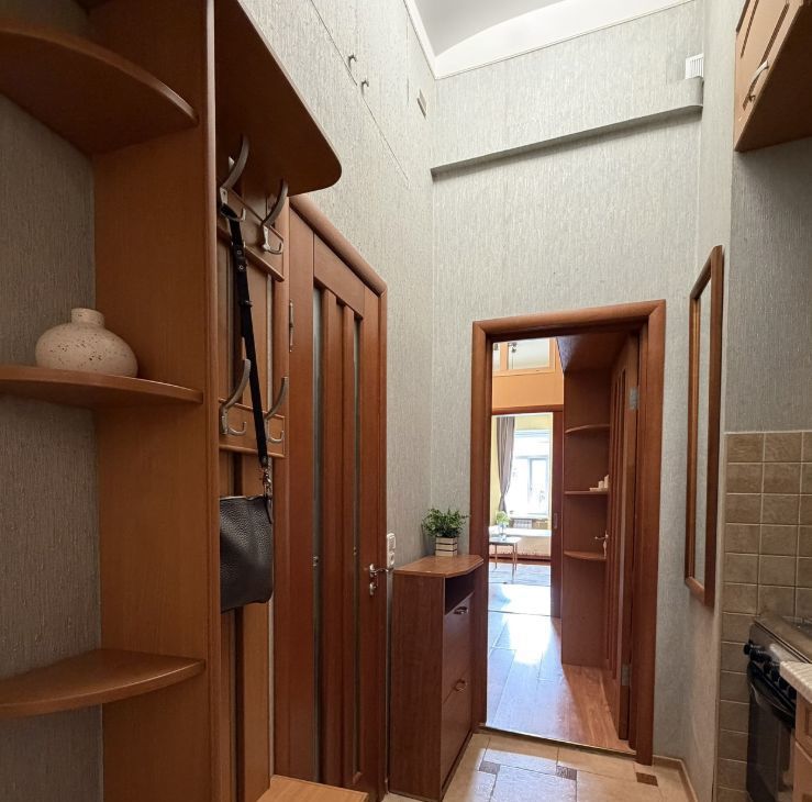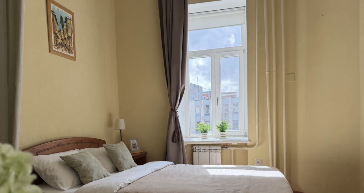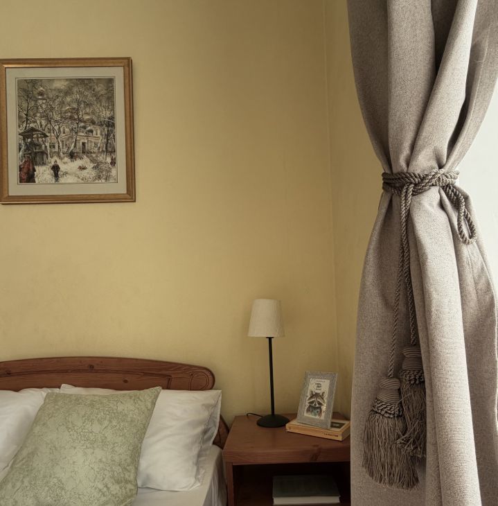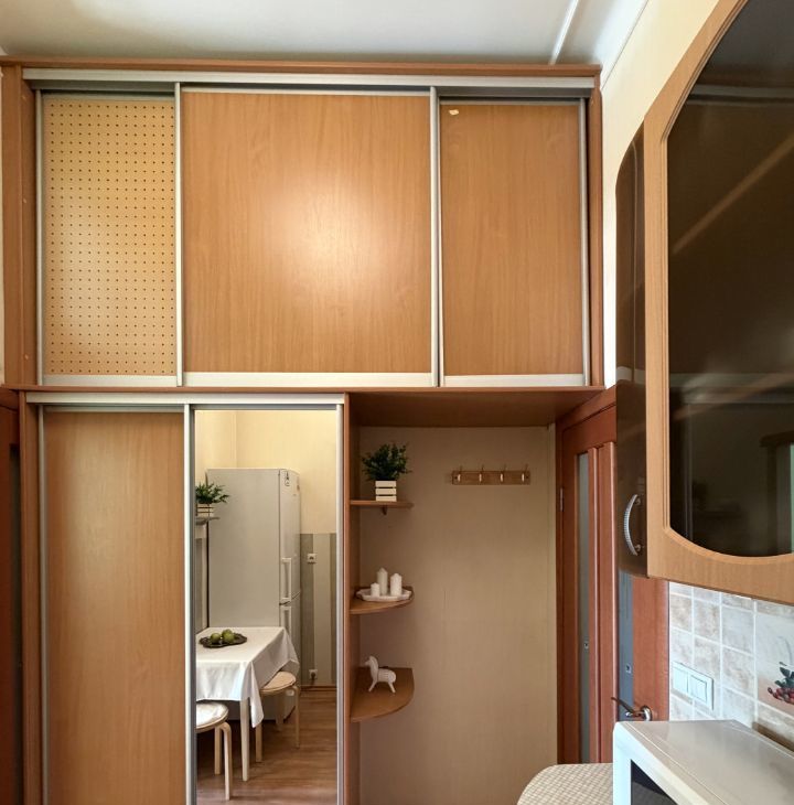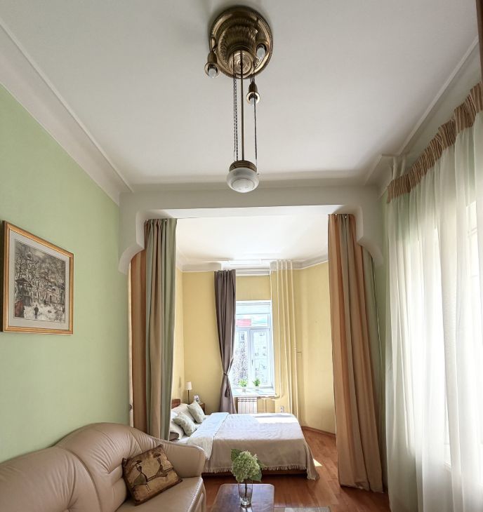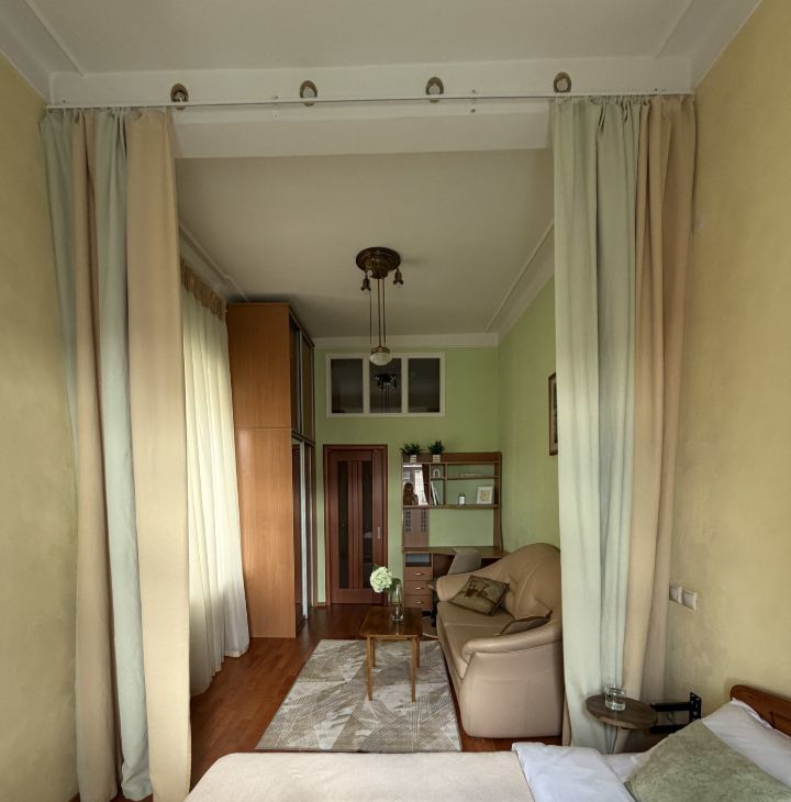 Квартира светлая с высокими потолками под 4 метра. Встроенные шкафы под самый потолок создают много места для хранения, есть полноценная кровать, раскладной диван и рабочий стол.