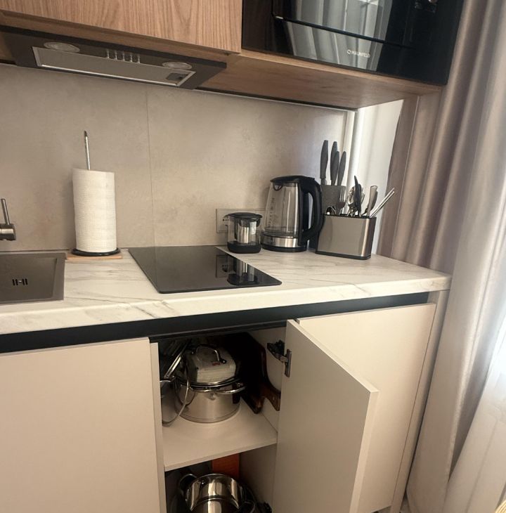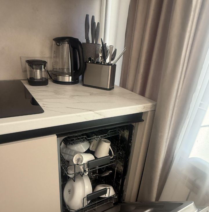 - Кухня полностью укомплектована: индукционная плита, посудомоечная машина, микроволновка, чайник, холодильник, встроенный фильтр для воды, полный набор посуды и столовых приборов.