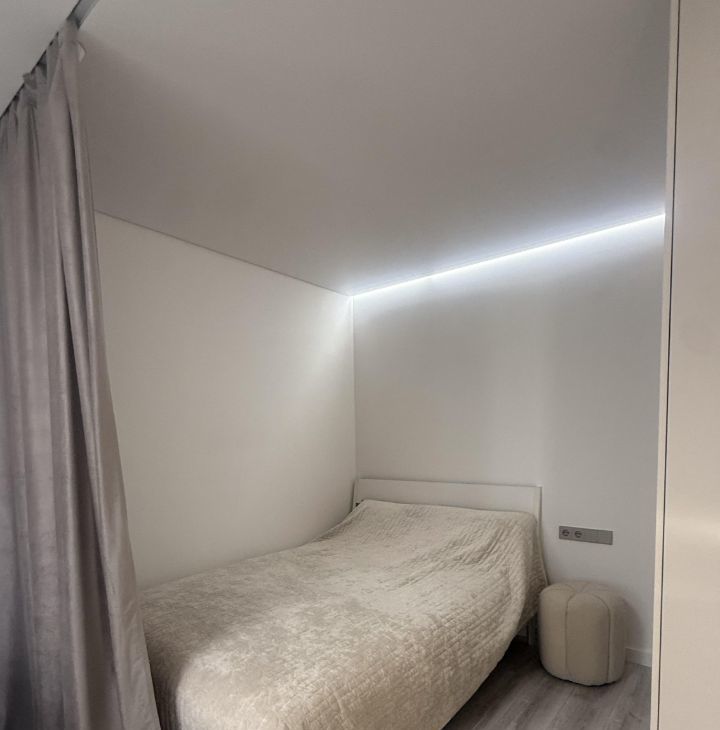 - Планировка: выделенная спальная зона и гостиная с разделителем.