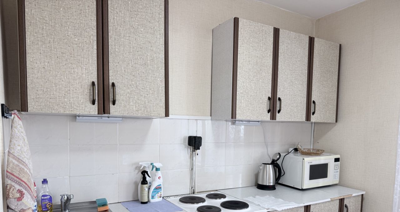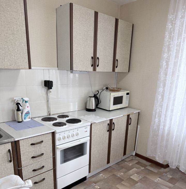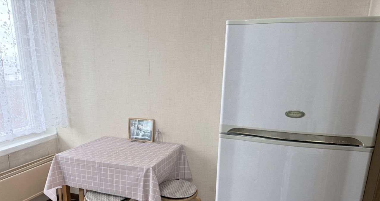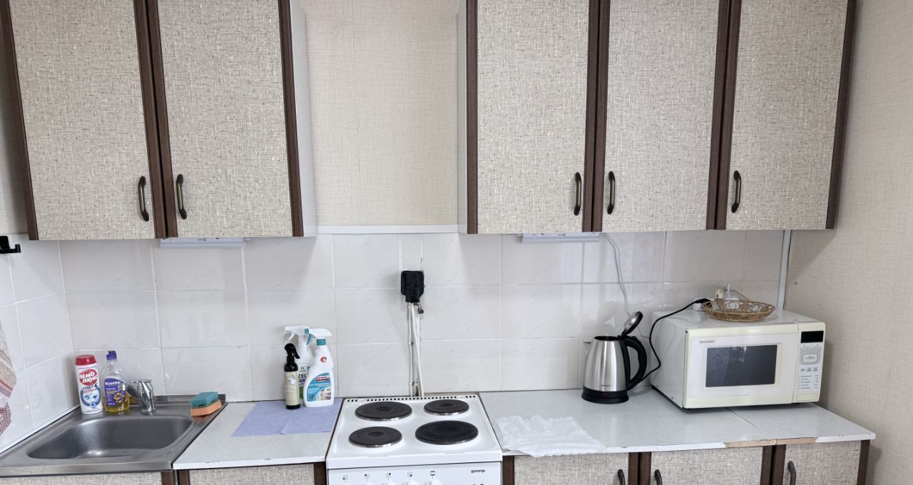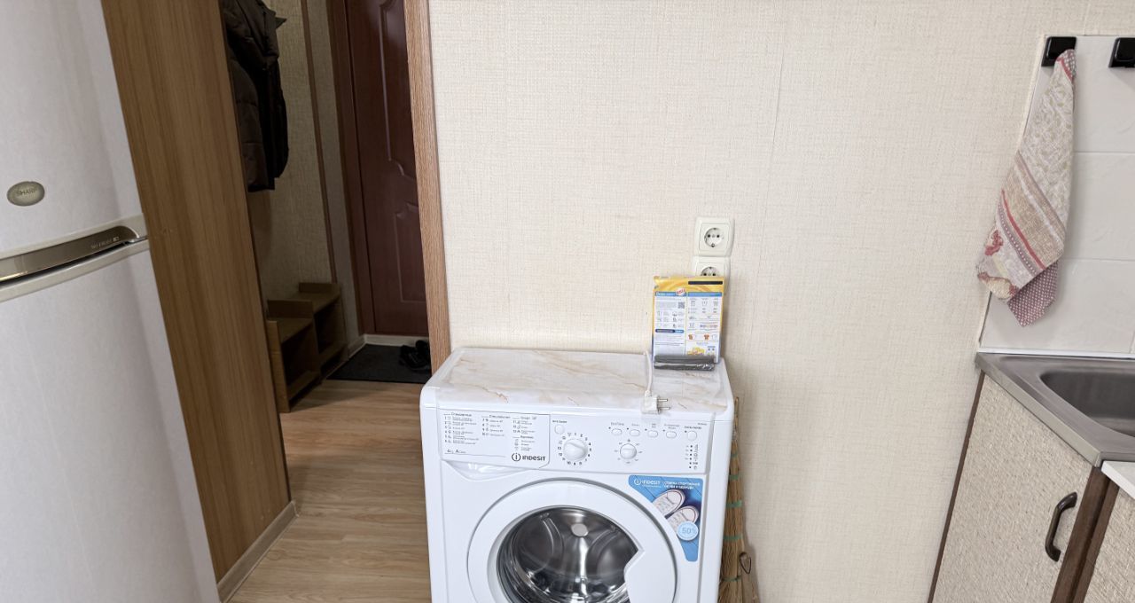 Скромная обстановка, но есть рабочее место , большой холодильник Шарп, новая стиральная машина, микроволновка, электрический чайник. Все как на фотографиях.
