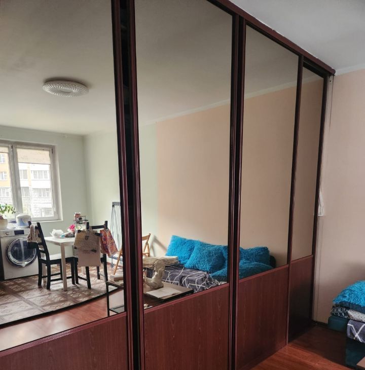 В гостиной большой встроенный зеркальный шкаф-купе фирмы Stanley.