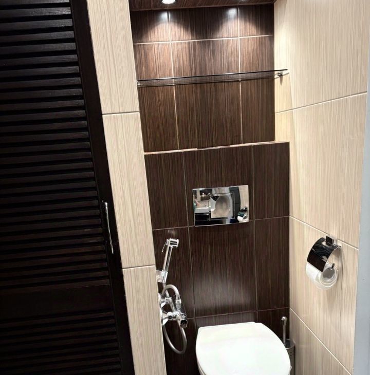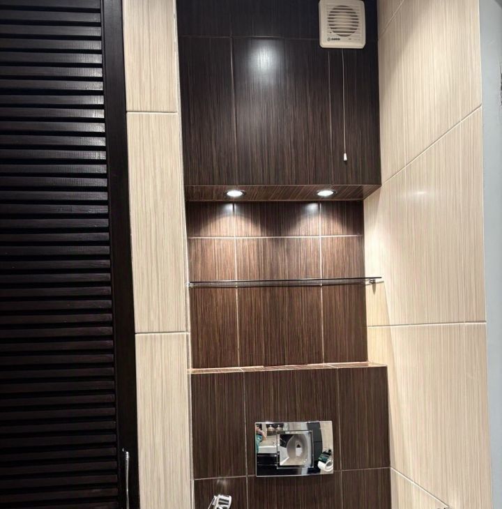 Совместный сан узел с встроенным хоз.шкафом, где спрятаны стиральная машинка, бойлер, полки для бытовой химии, коллекторная.