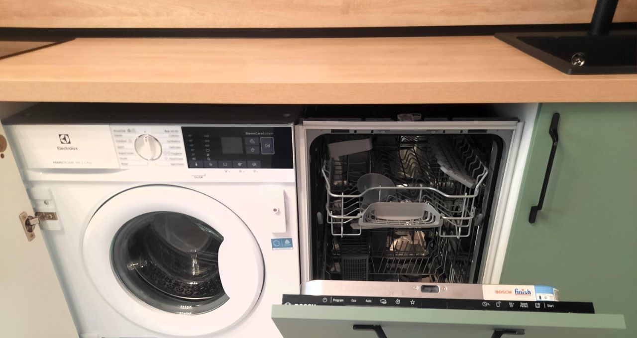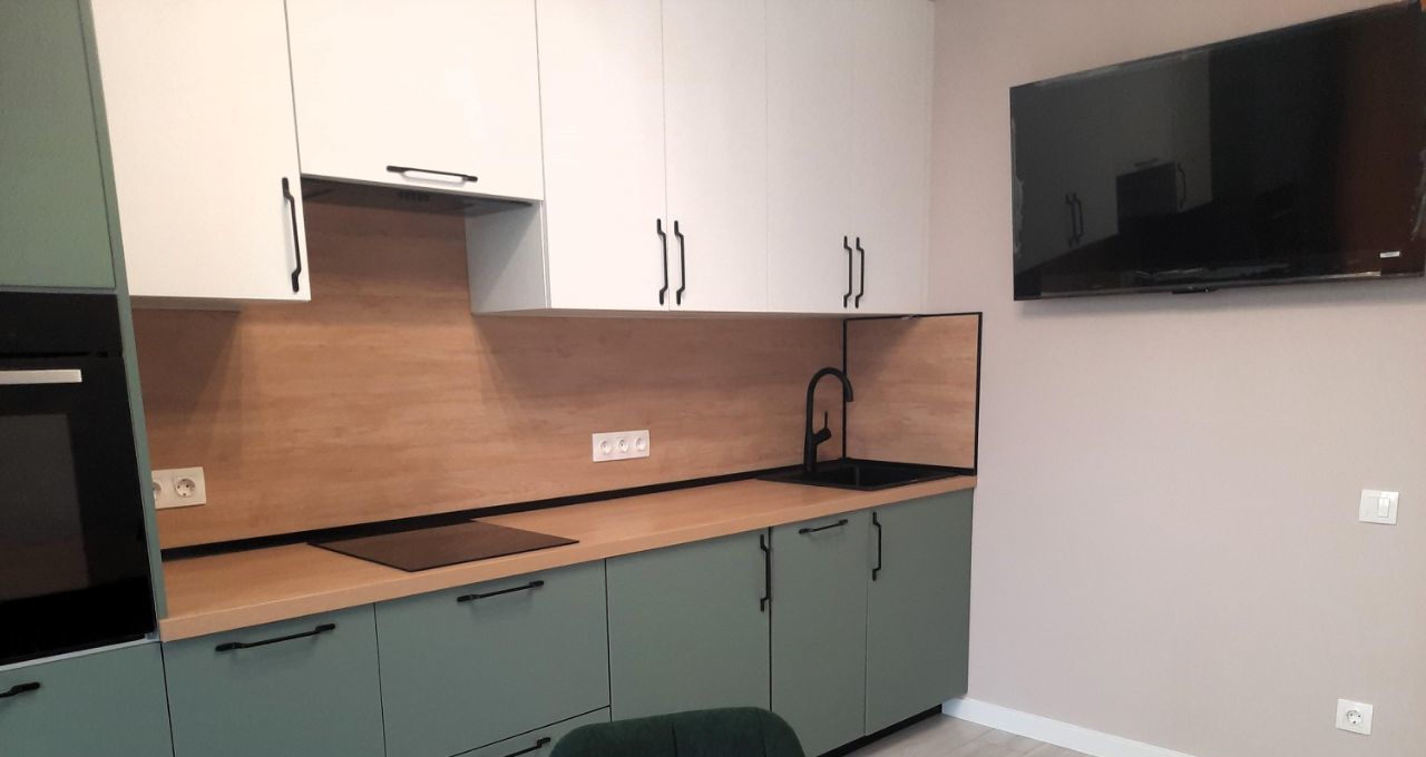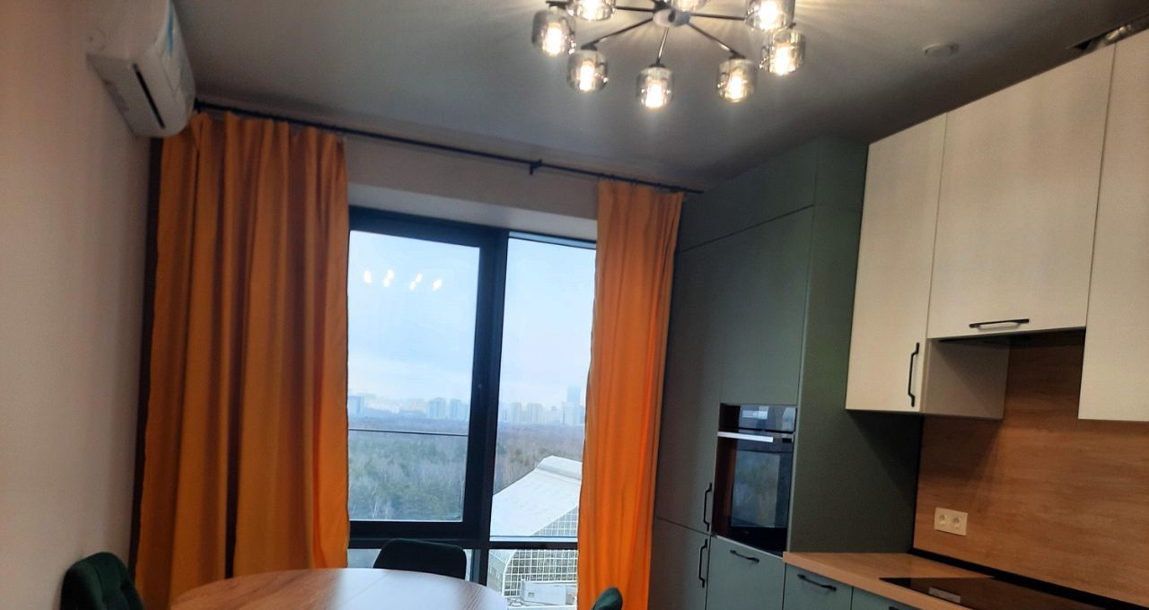 Квартира полностью укомплектована: кухня, техника (кондиционер, холодильник, стиральная машина, посудомоечная машина, духовой шкаф с свч, варочная панель, вытяжка, телевизор), обеденная зона.