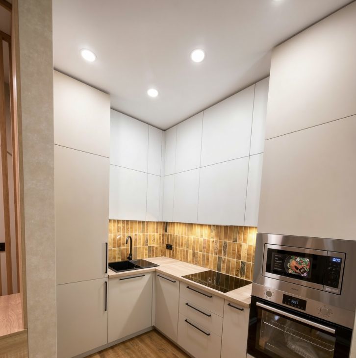 - Много продуманных систем хранения: шкафы в комнате и прихожей, кухня до потолка.