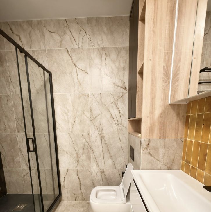 - Современный санузел с душевой кабиной, качественной сантехникой и местами для хранения.