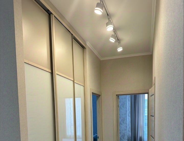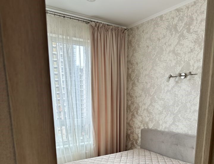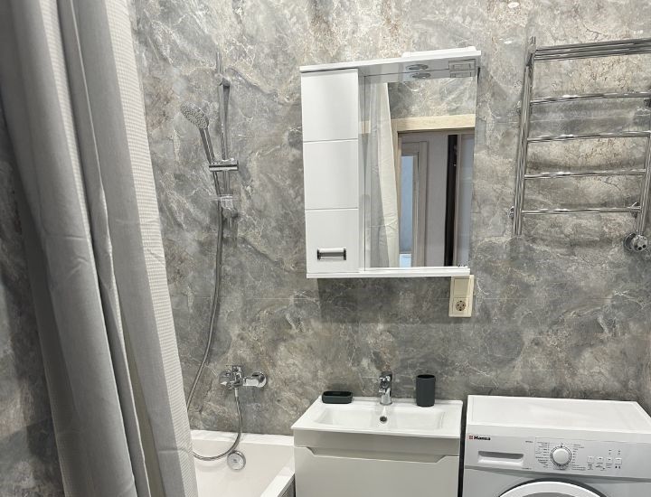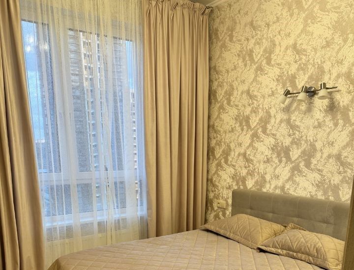 Квартира отличается высоким качеством отделки и полностью укомплектована для комфортного проживания. Кухня оборудована всей необходимой мебелью и современной бытовой техникой (холодильник, посудомоечная машина, плита). Для удобства предусмотрены кондиционер, телевизор и стиральная машина. В совмещенном санузле установлена ванна. В доме есть пассажирский и грузовой лифты, а также подземный паркинг. Интернет уже подключен. Район развитый, с отличной инфраструктурой: школы, детские сады и магазины находятся в пешей доступности