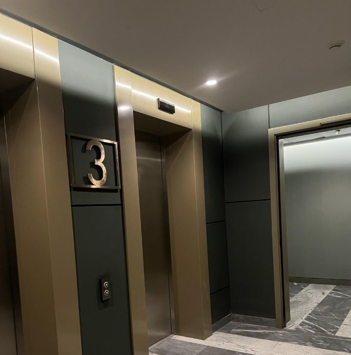 В нем предусмотрены современные удобства: один пассажирский и два грузовых лифта.