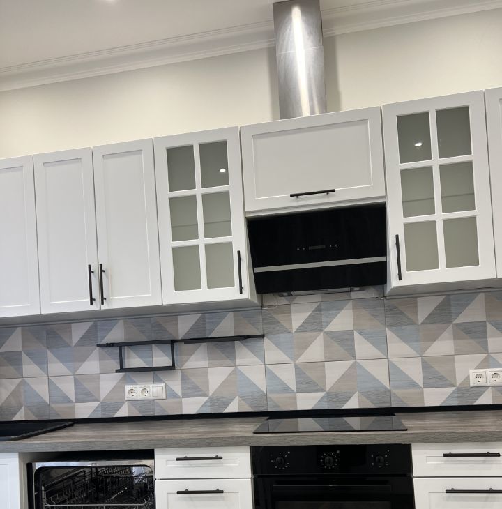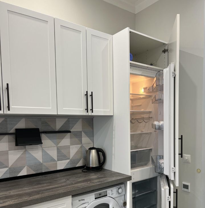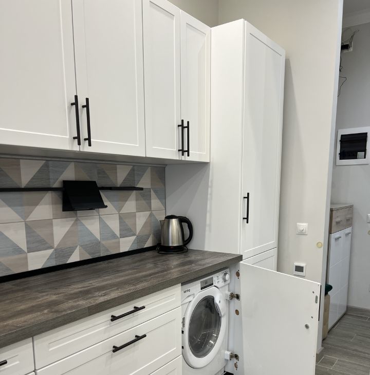 В просторной кухне площадью 17 кв. м есть вся необходимая мебель и техника: холодильник, посудомоечная машина, стиральная машина.