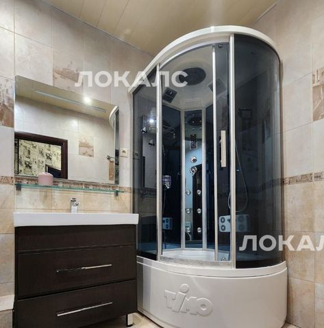 Современный санузел с качественной сантехникой, отделан венецианской плиткой, душевая кабина многофункциональная.