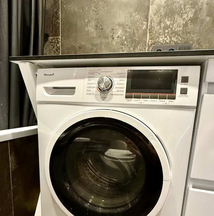 Просторная ванная: стиральная машина с сушкой, современная сантехника, тёплый пол.