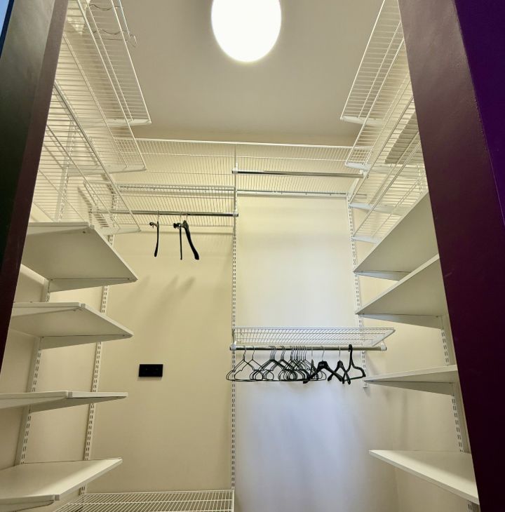 Спальня с большой встроенной гардеробной — хватит места для всей одежды. Также есть ниша для обустройства рабочего места.