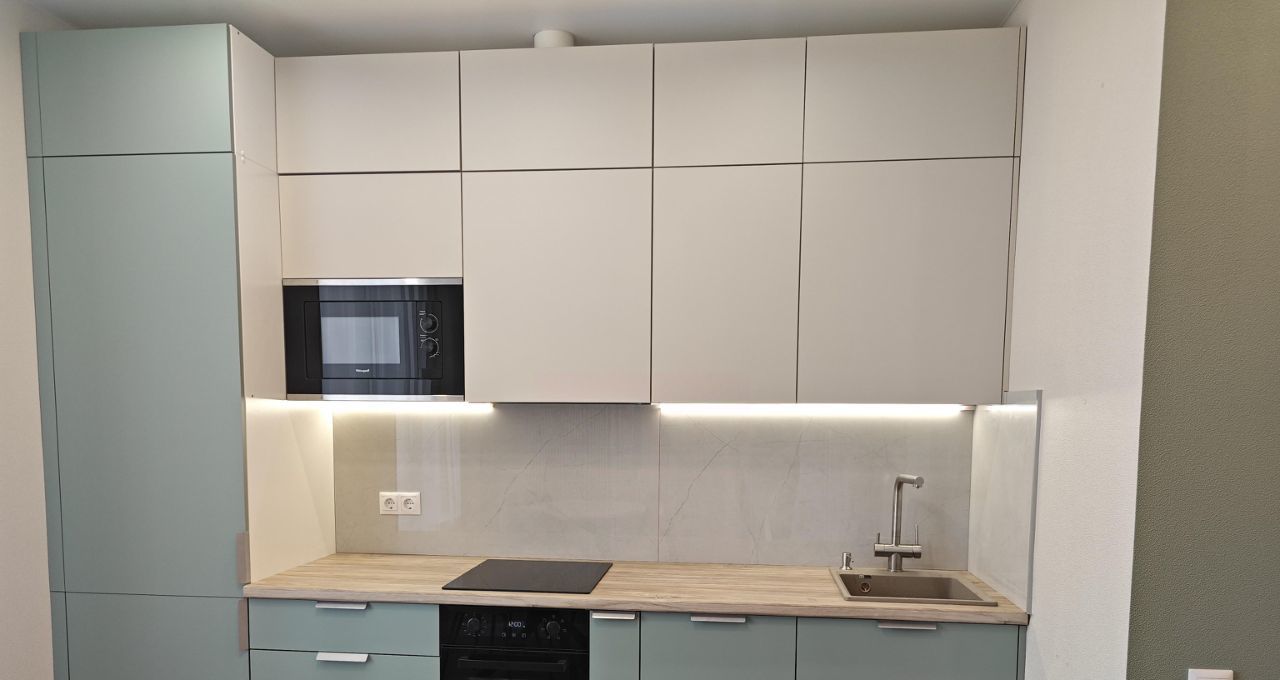 Кухня полностью оборудована всей необходимой техникой: посудомоечная машина, индукционная варочная панель, духовой шкаф, СВЧ-печь, вытяжка, встроенный холодильник. Система очистки питьевой воды Барьер.