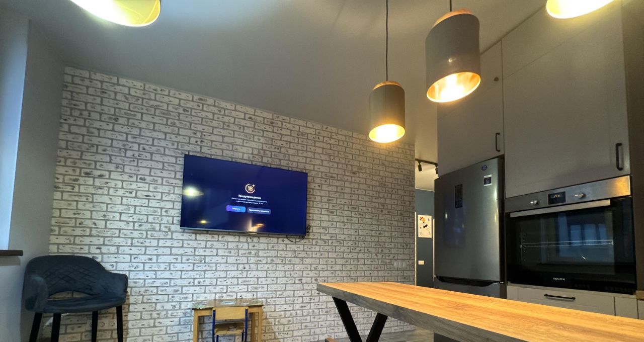 На кухне-гостиной также есть раскладной диван, большой двухкамерный холодильник, посудомоечная машинка, духовой шкаф, большой телевизор.