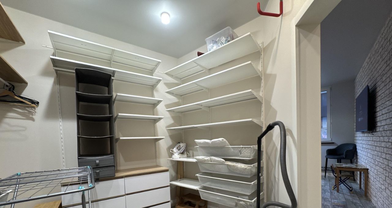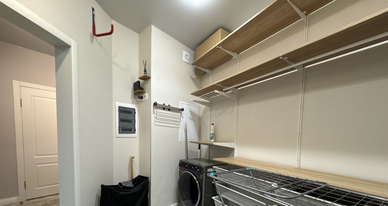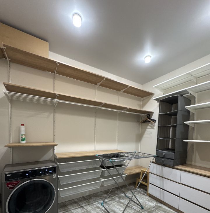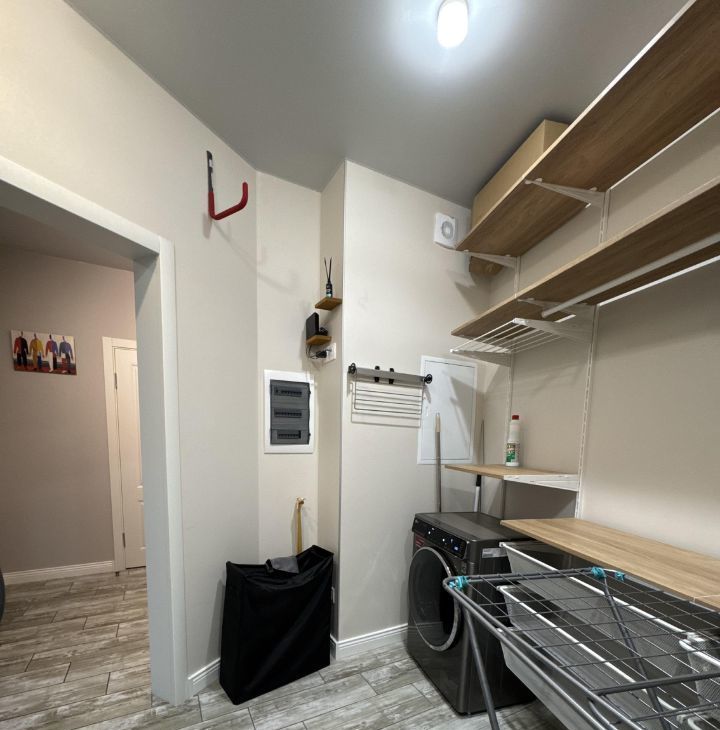 В квартире большая гардеробная 8 кв м, в которой оборудована система хранения и установлена стиральная машинка lg.