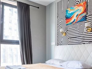 В квартире имеется всё необходимое: мебель и техника (кухня со всей необходимой техникой, включая большую посудомоечную машину. Санузел с черной матовой сантехникой и стиральной машиной. 2 гардеробные комнаты: в спальне и коридоре)