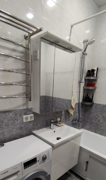 В ванной теплый пол, электросушитель. Коллекторная разводка отопления, стояков нет.