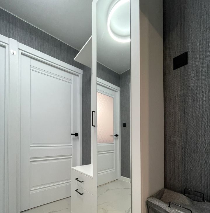 большой ТВ, стеллаж, трёхстворчатый шкаф с зеркалами;