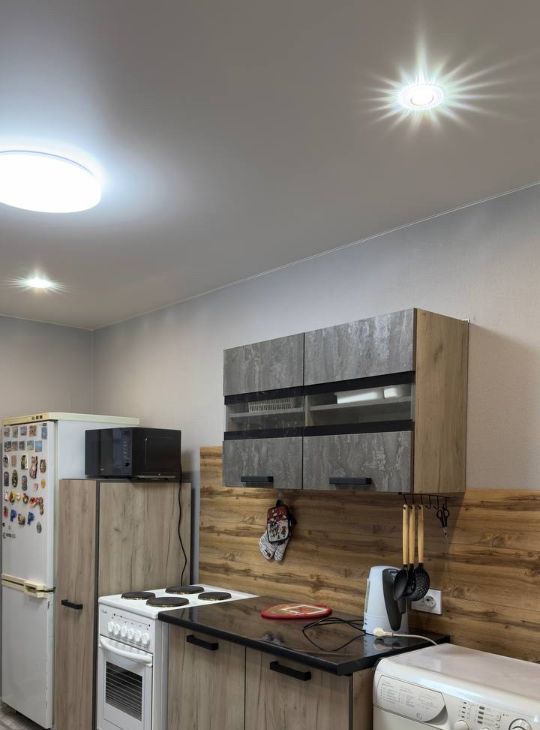 Есть вся необходимая бытовая техника: плита, холодильник, стиральная машина, микроволновка.