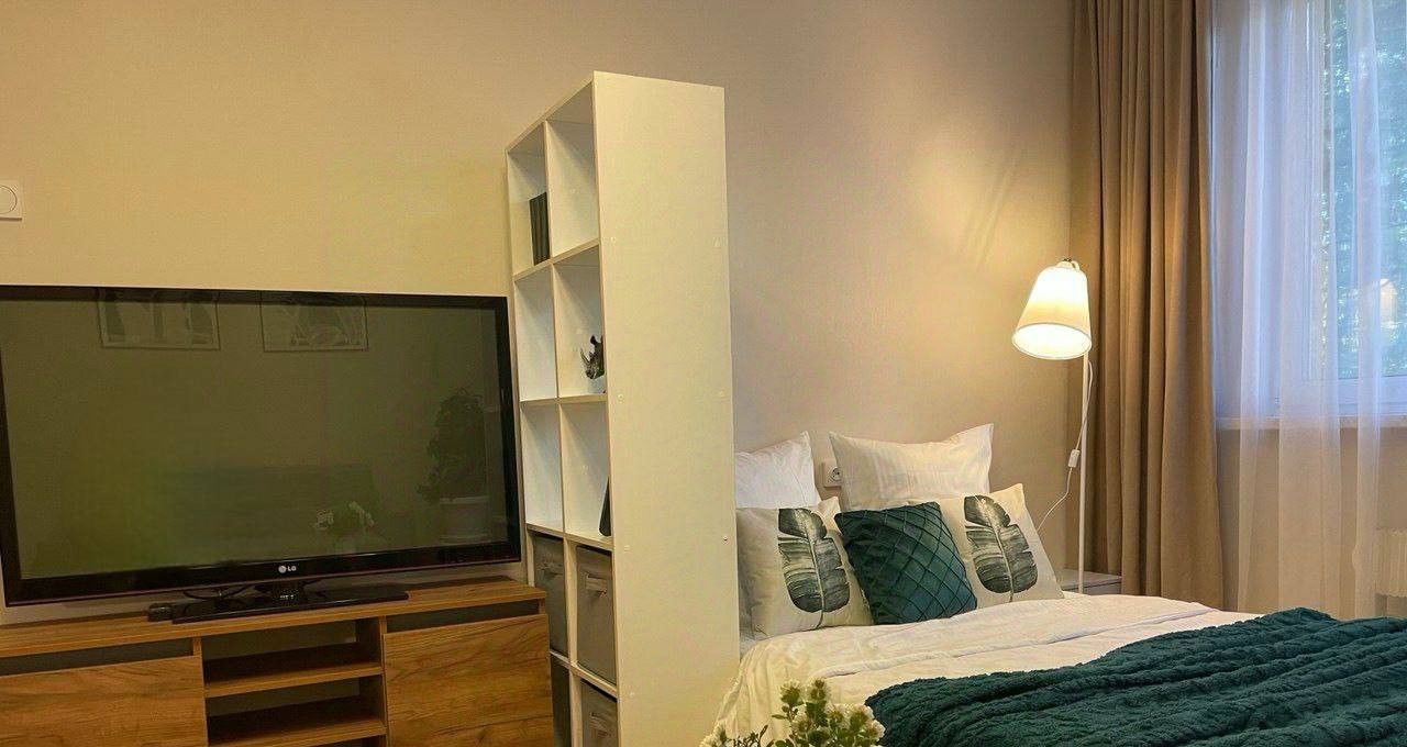Просторная комната с грамотным зонированием: спальная зона с кроватью 140 см, гостиная с диваном и большим телевизором, а также отдельная рабочая зона с удобным креслом.