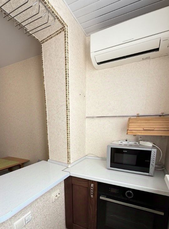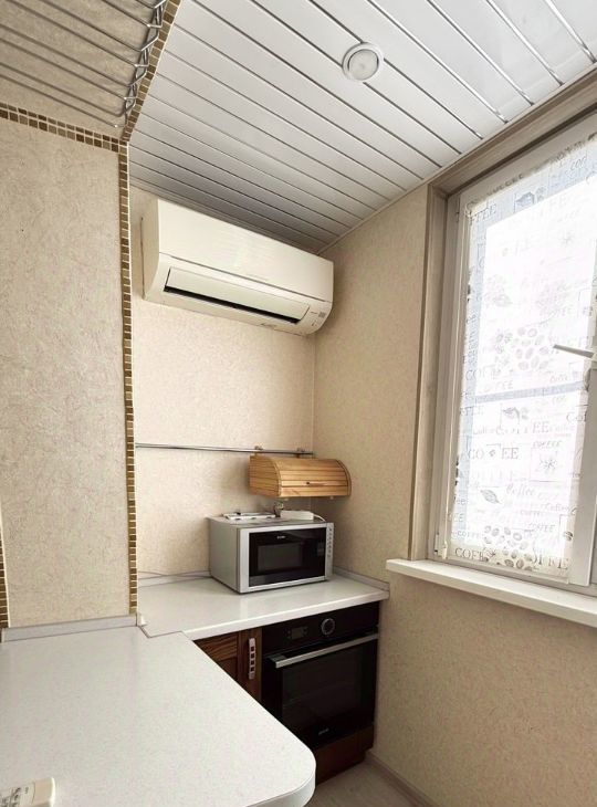 Полностью оборудованная кухня с встроенной бытовой техникой: варочная панель, микроволновая печь, духовой шкаф, посудомоечная машина, стиральная машина и холодильник. Кондиционер в комнате и на кухне.
