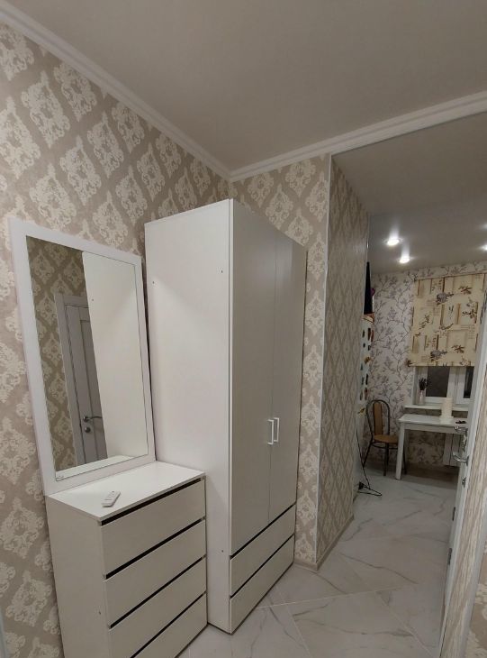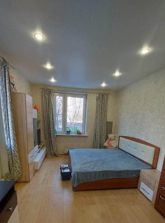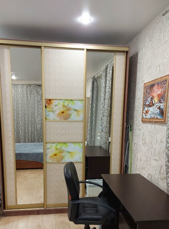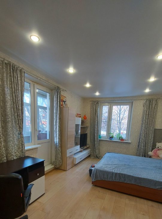 Сдаётся уютная квартира на втором этаже панельного дома с современным евро ремонтом на длительный срок. В квартире сделан свежий ремонт, что видно по новым отделке стен и напольному покрытию. Просторная комната оборудована всем необходимым: вместительный шкаф, письменный стол и широкая кровать. Из мебели также есть вместительные шкафы и комод.
