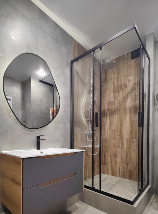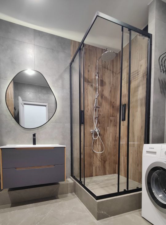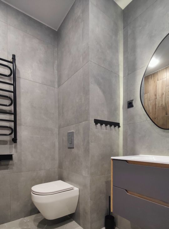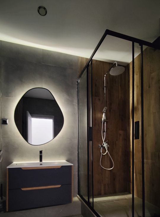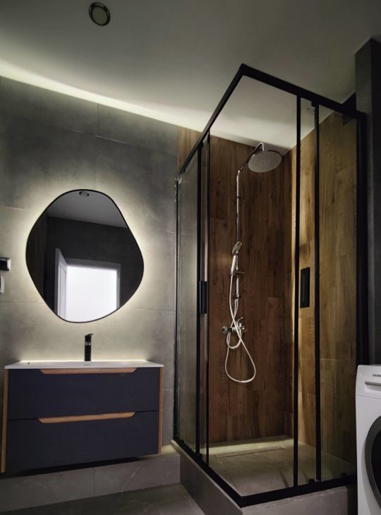 В санузле теплый пол, душевая кабина, стиральная машина, инсталляция с/у, раковина + зеркало с подсветкой.
